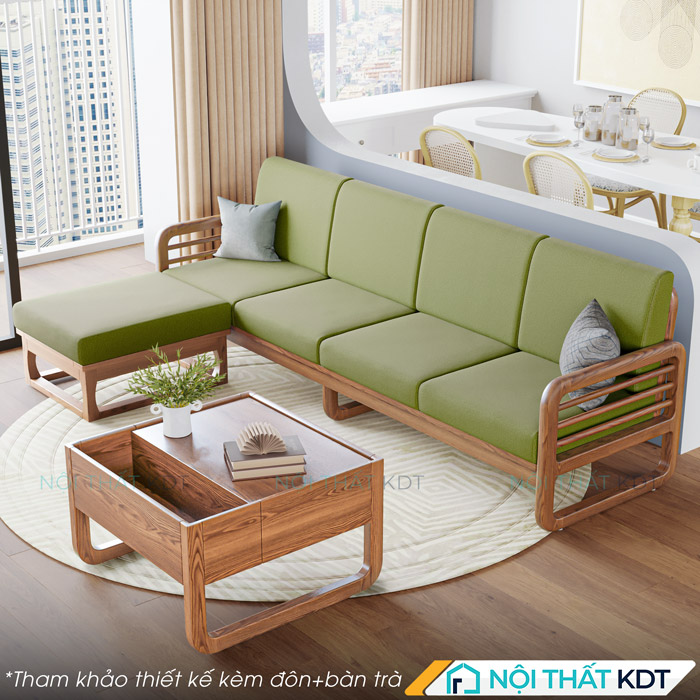Bộ ghế sofa văng gỗ S175-L4 gồm một ghế sofa 3 chỗ 2m4 và một đôn to 60x60cm, có thể linh hoạt đảo chiều để tạo góc L trái hoặc phải tùy không gian.